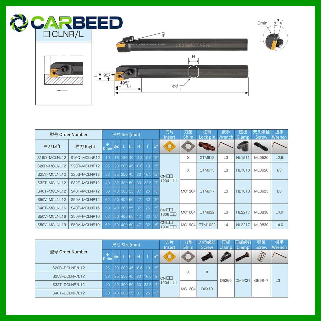 يعمل قلم MCLNR الداخلي مع سنون من نوع CNMG فص 12، وهي سنون مربعة سالبة ذات 4 حواف قطع فعالة، معروفة بعمرها التشغيلي الطويل وقدرتها العالية على التشغيل المتوسط والخشن.