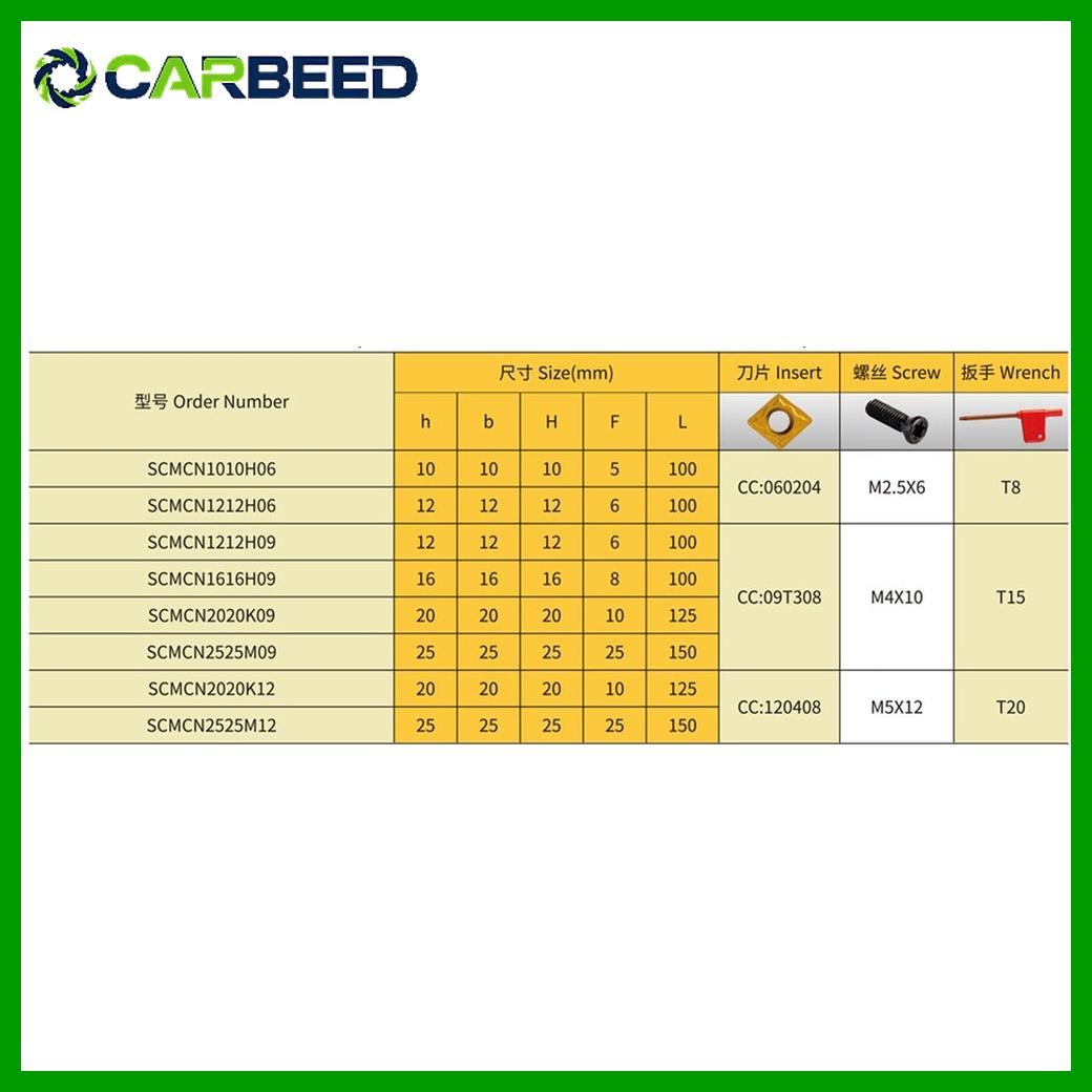 يعمل قلم SCMCN مع سنون من نوع CCMT فص 09 (شكل ماسي 80 درجة)، وهي سنون موجبة (Positive Insert) معروفة بسهولة القطع وقلة مقاومة الخامة، مما يجعلها مناسبة للتشغيل الدقيق والمتوسط، خاصة على ماكينات CNC ذات القدرة المتوسطة.
